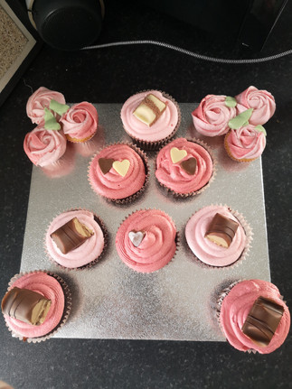 I made chocolate cupcakes using the 'ULTIMATE CHOCOLATE CUPCAKES' recipe from 'Pretty Simple Sweet' {https://prettysimplesweet.com/ultimate-chocolate-cupcakes/#wprm-recipe-container-11289 }, I made 18 cupcakes with this recipe and topped them with the Renshaw's vanilla frosting (I just added food colouring) plus some Kinder Bueno's and some chocolate hearts.